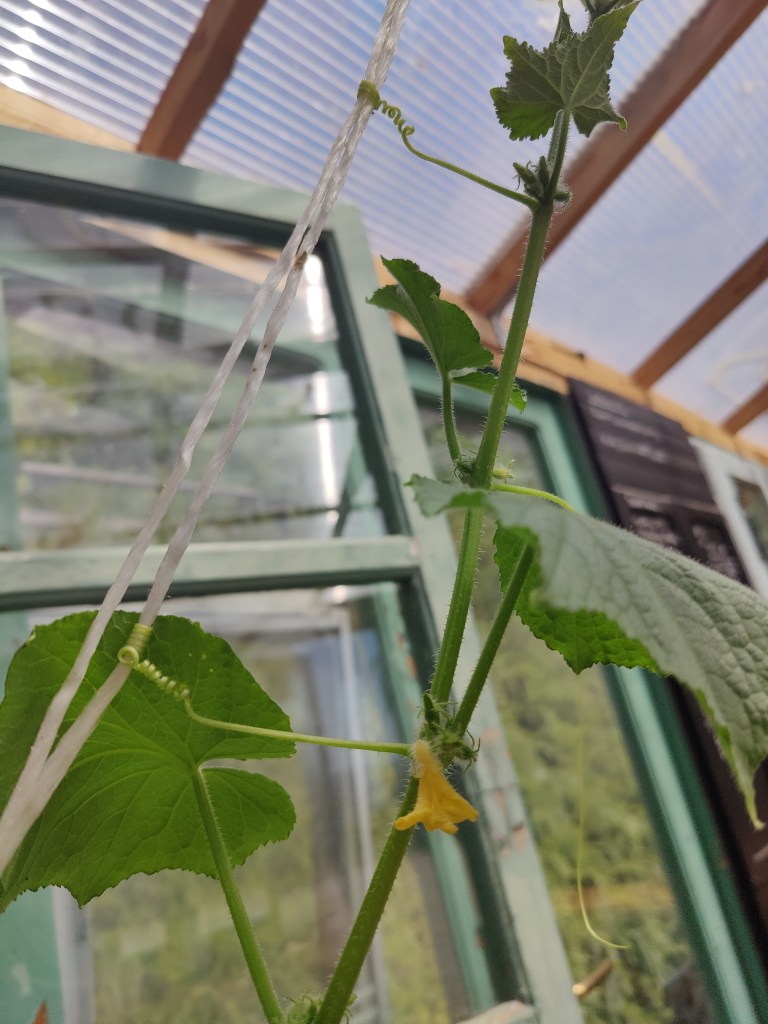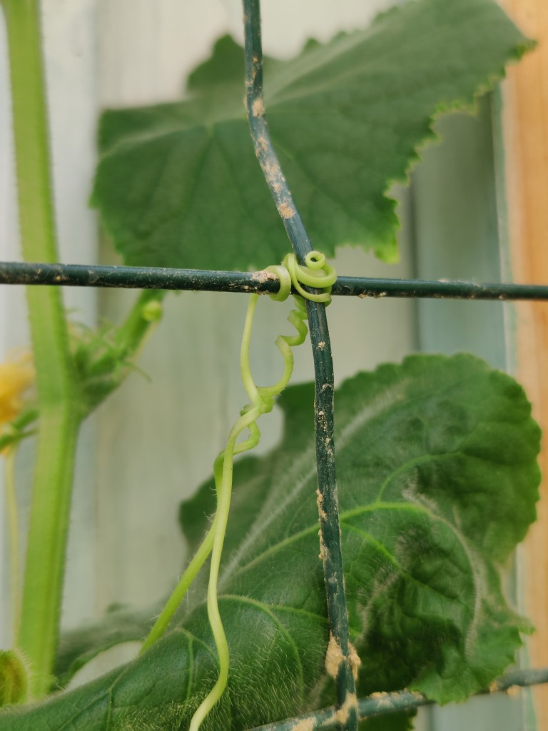 Here are some pictures I took yesterday morning of my 3 month old cucumber plants (I sowed them indoors in mid-April). Their tentacles wrap themselves around whatever is available to provide support for the fruit they will bear.